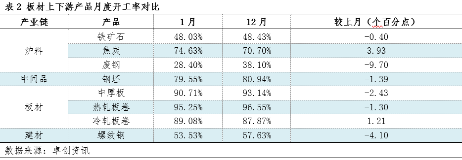 1月板材财产链上下逛及相关品开工率大都下降,仅焦炭及冷轧板卷开工率环比上升。冷轧开工率上升,次要是由于冷卷利润乐不雅,焦炭开工率上升则是由于原材料供应充脚,现实需求端表示环比下降,焦企利润下滑。